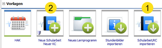 Gehen Sie in der LPS (Lernprozesssteuerung) zu einer Lerngruppe und klicken Sie (z. B. im Abschnitt "calwin") auf Arbeitsprogramme zusammenstellen. Im Abschnitt "Vorlagen" können Sie eine Schularbeitenvorlage importieren (1) oder eine neue Schularbeit frei zusammenstellen (2).