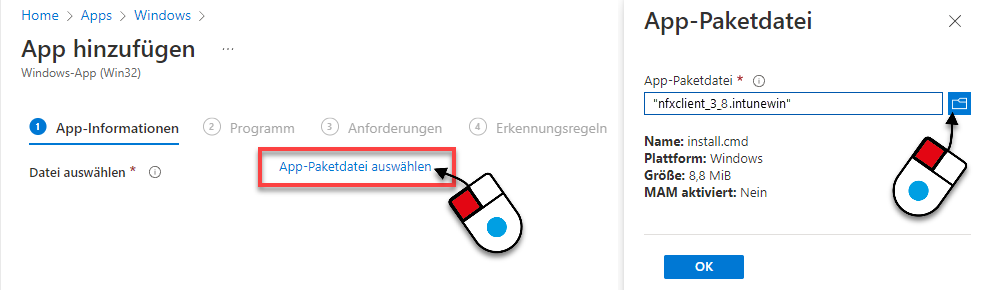 Wählen Sie bei Schritt 1 einer der folgenden Paketdateien aus! Die Paketdatei "intunewin" haben wir für Sie vorbereitet. Sie können diese hier herunterladen und weiterverwenden: