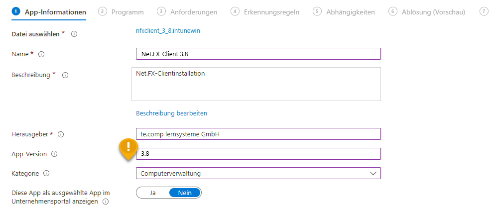 Geben Sie anschließend die App-Informationen wie in folgender Abbildung ein. Die App-Version entnehmen Sie bitte aus dem Namen der Paketdatei (hier: 3.8).