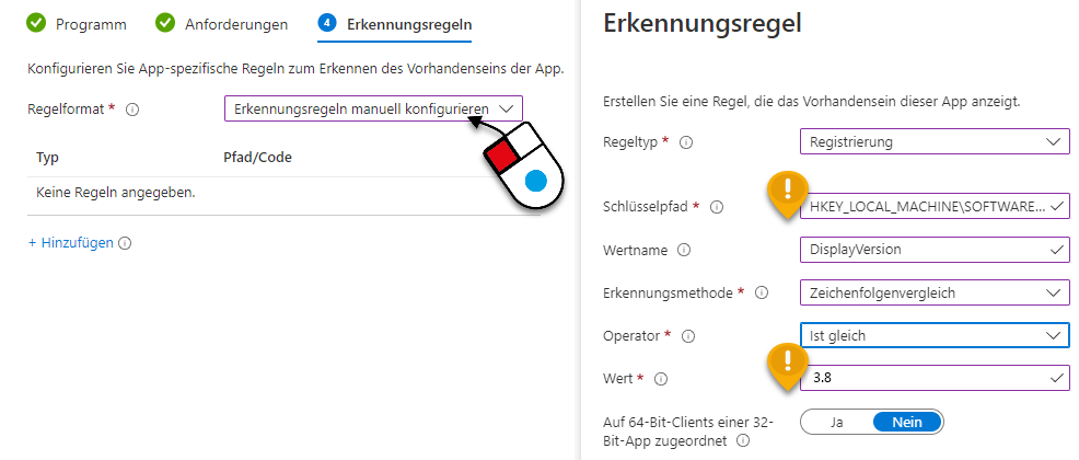 Wählen Sie "Erkennungsregeln manuell konfigurieren" und geben Sie die Daten lt. Abbildung ein. Den Eintrag Wert entnehmen Sie bitte aus dem Namen der Paketdatei (hier: 3.8).