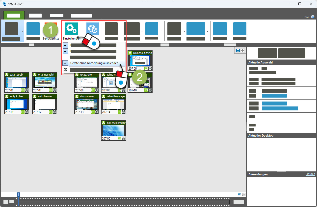 Über die Einstellungen (1) und "Geräte ohne Anmeldung ausblenden" (2) können Sie alle Clients ohne Anmeldung ausblenden.