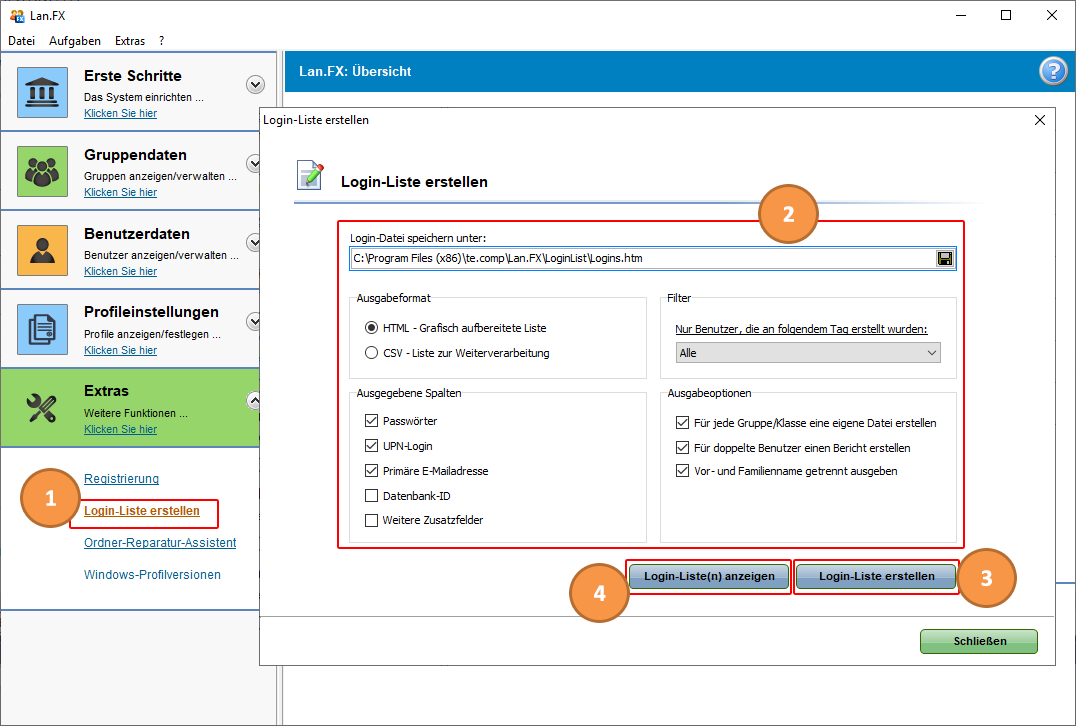 Klicken Sie auf "Login-Liste erstellen" (3). Um den Ordner zu öffnen, in dem die Login-Liste(n) enthalten ist/sind, klicken Sie auf "Login-Liste(n) anzeigen" (4).
