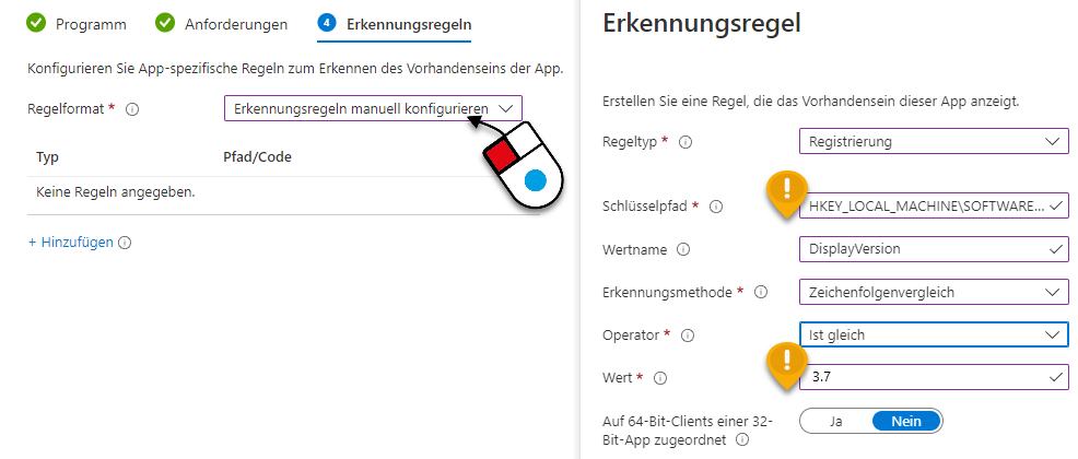 Wählen Sie "Erkennungsregeln manuell konfigurieren" und geben Sie die Daten lt. Abbildung ein. Den Eintrag Wert entnehmen Sie bitte aus dem Namen der Paketdatei (hier: 3.7).