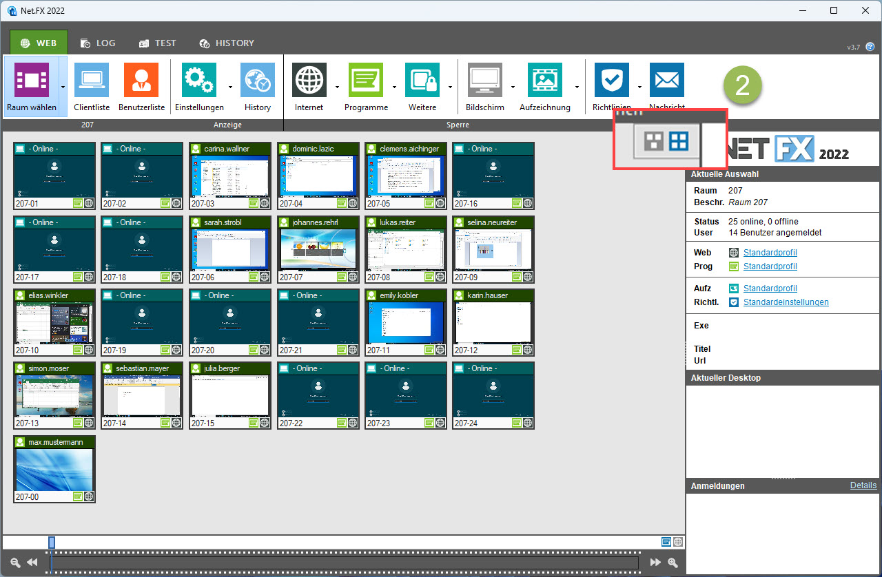 Hier (1) ist die "normale Raumansicht" (Standard) ausgewählt.