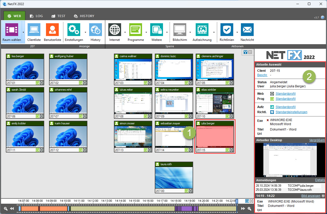 Markieren Sie den Client (1), für den Sie die Informationen anzeigen lassen wollen. Hier (2) erhalten Sie Informationen über den aktuell gewählten Client. (Zum Beispiel: Clientname, Profile für die Internet- bzw. Programmsperre, aktuell verwendetes Programm, aktueller Desktop uvm.)